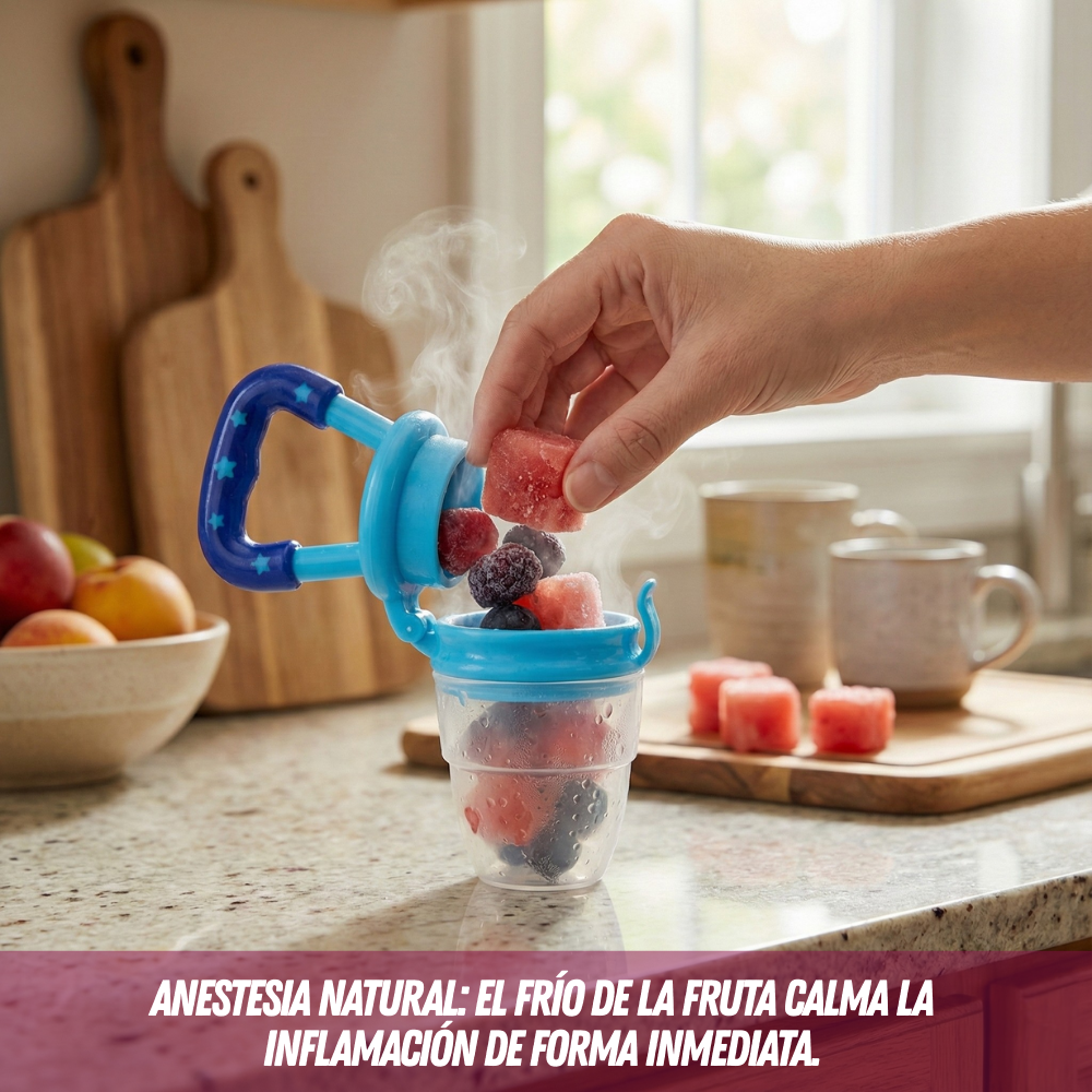 2️⃣ ¡Al congelador!: Enfría la fruta un rato. El frío es la clave para anestesiar y desinflamar esas encías rebeldes.