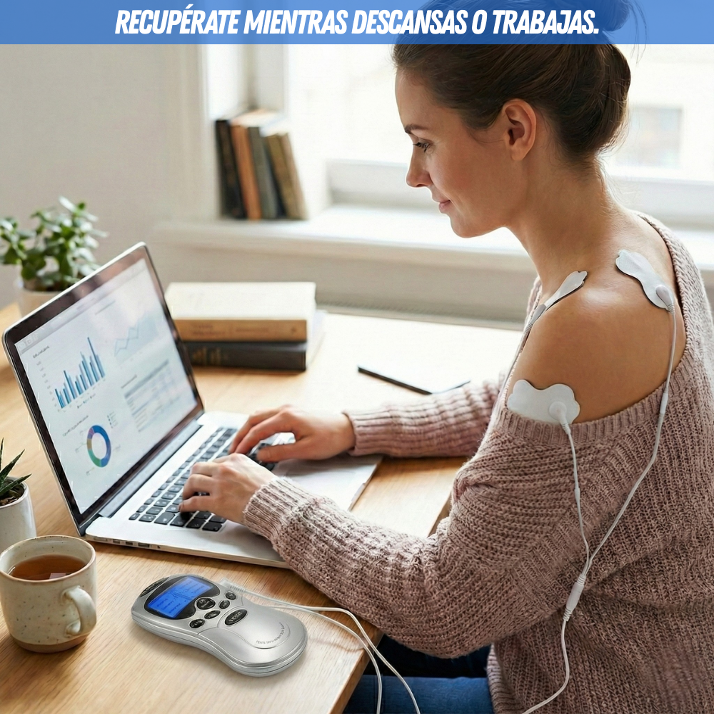 TecnoFisio™ usa micro-pulsos que penetran profundo en el músculo para soltar los nudos más rebeldes, atacando el dolor desde la raíz. Es como tener un masajista experto que desactiva la tensión desde adentro, devolviéndote el alivio que los parches comunes simplemente no alcanzan.