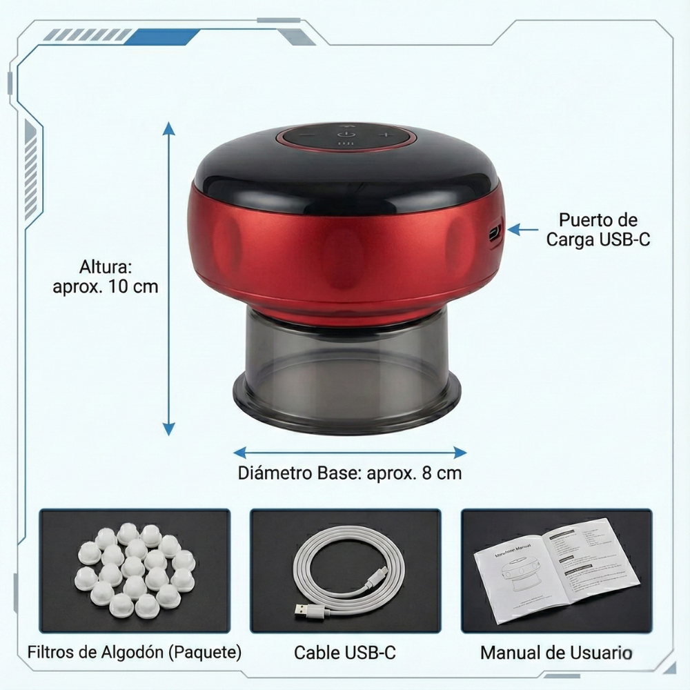 Niveles de Succión: 6 intensidades ajustables (desde un masaje suave hasta una succión profunda para nudos rebeldes).