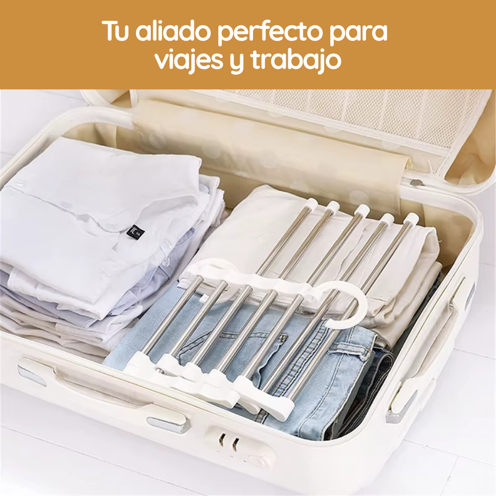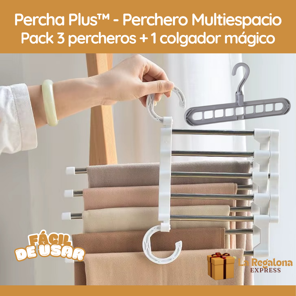 PerchaPlus™ es una percha multifunción 5 en 1, hecha con acero inoxidable y plástico de alta resistencia, diseñada para ayudarte a organizar tu armario y aprovechar al máximo cada centímetro de espacio.